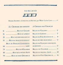 O sumário. Na primeira linha é indicada a introdução, e em seguida os títulos dos capítulos em francês na coluna esquerda, e em português, na direita.
